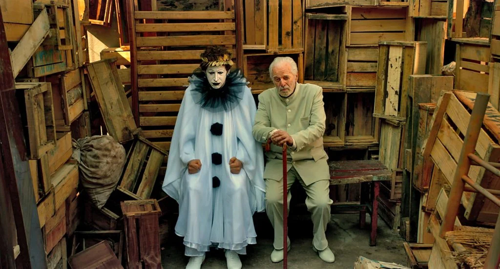 На снимке: клоун в костюме Пьеро с напудренным лицом и пожилой мужчина в светлом костюме, с тростью, сидят среди деревянных ящиков.