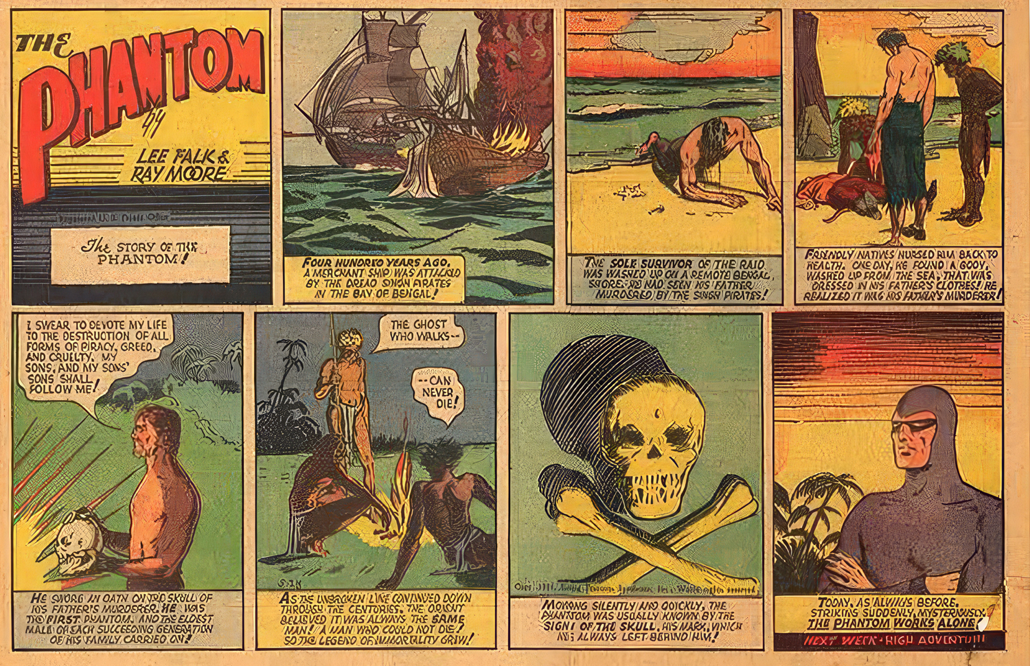 Этот суровый и физически могучий персонаж, чья легенда строится на идее многовековой преемственности, обитает в сокрытой пещере, хранимой коренными народами. Каждый новый Фантом, наследуя мантию, дает клятву «борьбы с пиратством, жадностью, жестокостью и несправедливостью во всех их проявлениях» — как провозглашено в первой же полосе 1939 года. Обряд инициации включает клятву на черепе убийцы отца. Эта непрерывная линия защитников, сменяющих друг друга, породила миф о «Человеке, который не умирает».