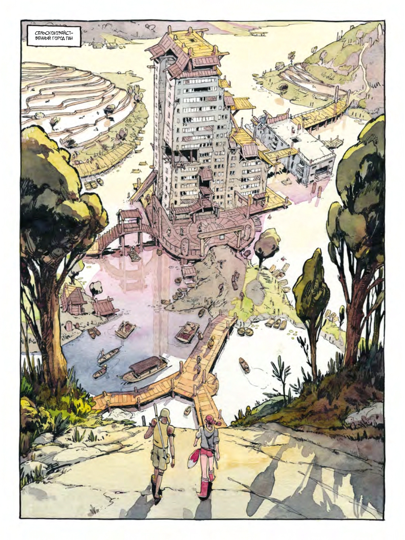 Наши два героя бродят по постапокалиптическим декорациям средь танков, руин домов и запретных зон… Мы невольно задаемся вопросом: ждет ли и наш мир такое будущее? Автор во всей красе раскрывает свой талант графического художника в великолепных полноформатных иллюстрациях, подобных панорамному виду цитадели Пана.