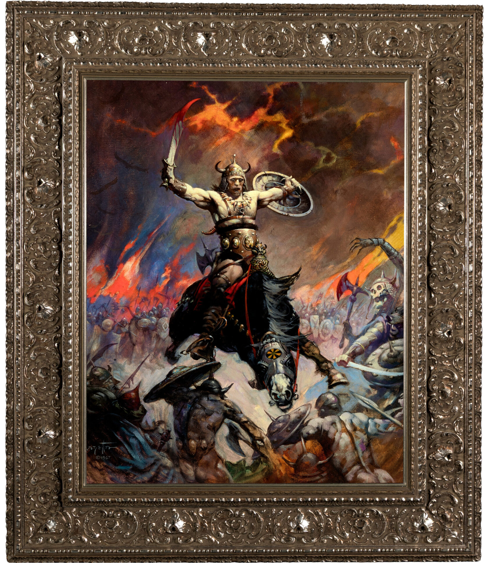 В этой работе сконцентрирована вся гениальность Фразетты. Обнаженный по пояс герой на угольно-черном скакуне не просто сражается — он воплощает собой слепую ярость («берсеркерство»), становясь, по меткому замечанию Джо Маддалены из аукционного дома, «стихийной силой, а не просто героем бульварных романов». Огненный ландшафт, скелет с секирой и темное воинство на заднем плане — это не фон, а воплощение хаоса, который встречает на своем пути неудержимая первобытная мощь. Фразетта виртуозно пропускал через себя и передавал на холст чистую энергию и психологическую глубину через фирменные композицию, жест и игру света.
