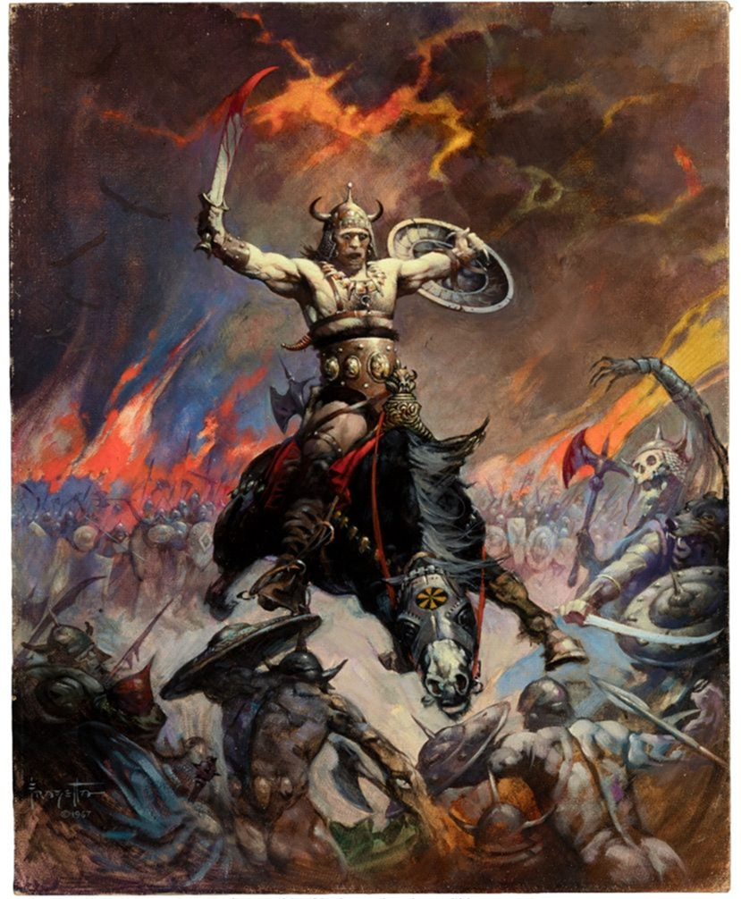 Картина «Конан-берсерк», написанная маслом в 1967 году, — это не просто иллюстрация. Это исходная, каноническая обложка для романа Роберта И. Говарда «Час дракона». Именно кисть Фразетты наделила Конана-киммерийца той визуальной мощью, которая на десятилетия вперед определила его образ в массовой культуре — от культовых бумажных изданий до эпического воплощения Арнольдом Шварценеггером в «Конане-варваре».